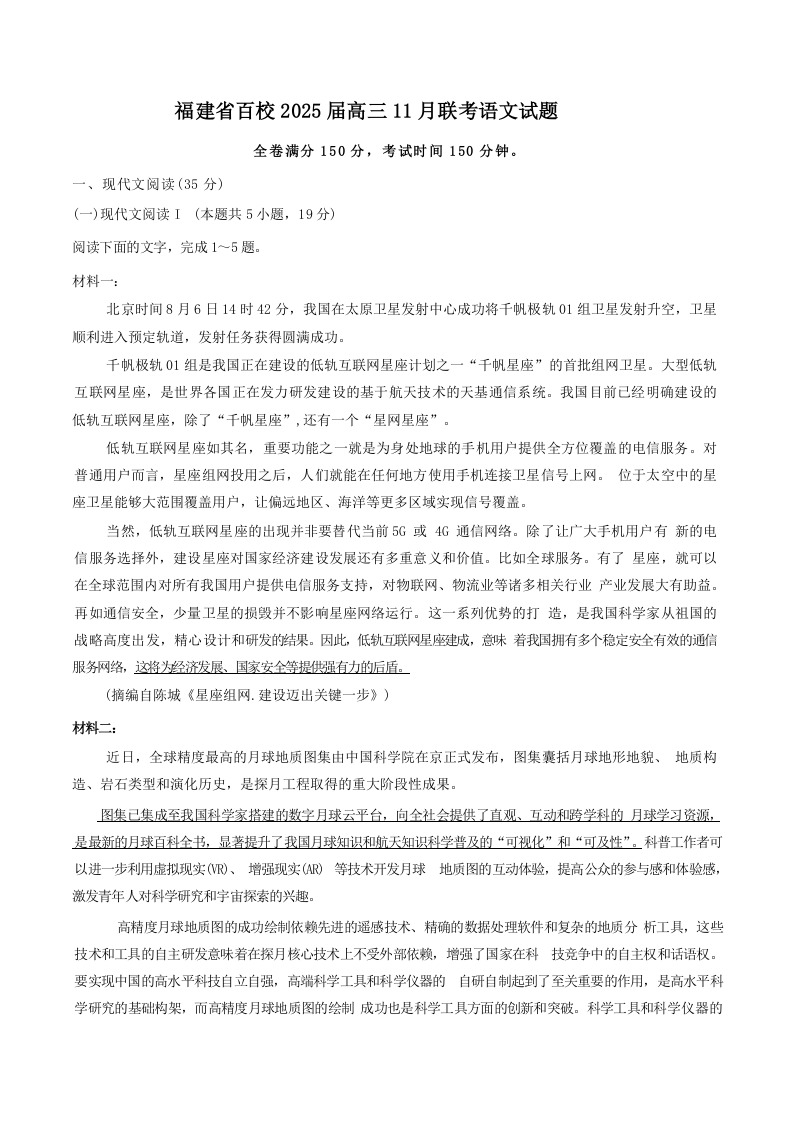 福建省2024-2025学年金科大联考高三11月测评语文及答案