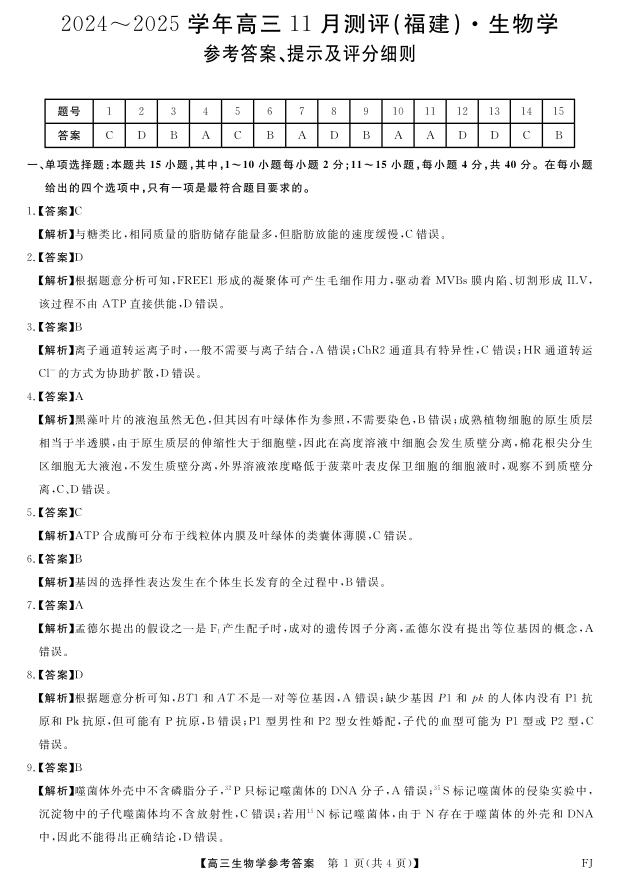 福建省2024-2025学年金科大联考高三11月测评生物答案