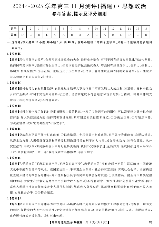 福建省2024-2025学年金科大联考高三11月测评政治答案