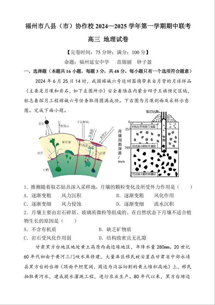 福建省福州市八县(市)协作校2024-2025学年高三上学期期中联考地理及答案