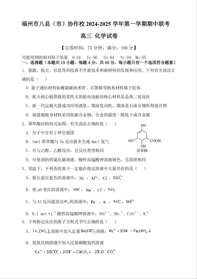 福建省福州市八县(市)协作校2024-2025学年高三上学期期中联考化学及答案