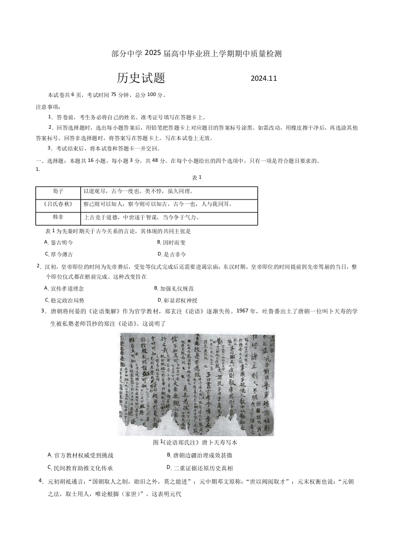 福建省名校联盟2025届高中毕业班上学期期中质量检测历史