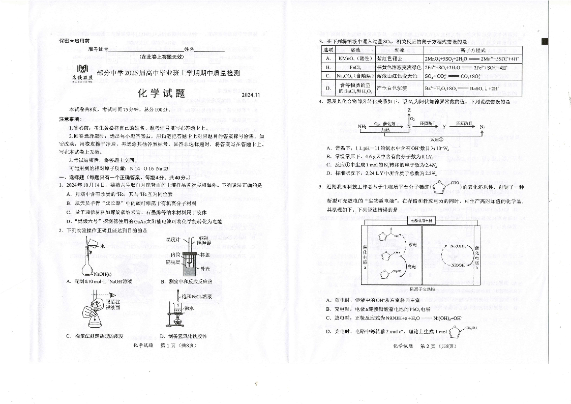 福建省名校联盟2025届高中毕业班上学期期中质量检测化学