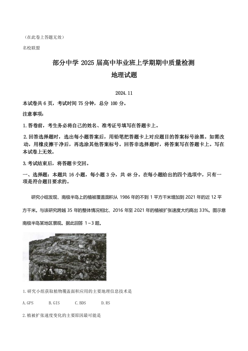 福建省名校联盟2025届高中毕业班上学期期中质量检测地理及答案
