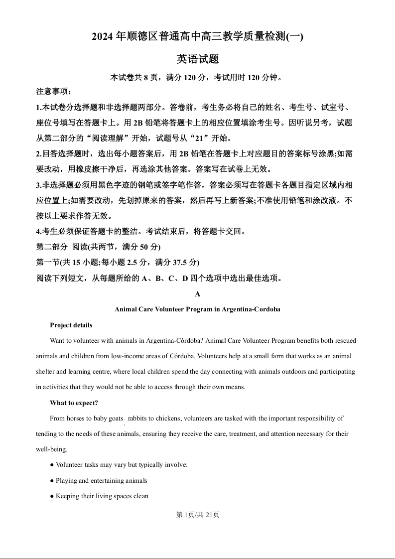 广东省佛山市顺德区普通高中2024-2025学年高三上学期教学质量检测(一)英语答案
