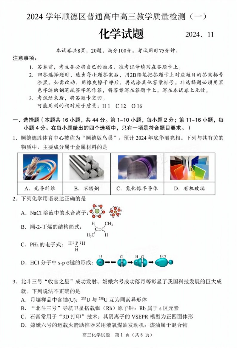 广东省佛山市2024学年顺德区普通高中高三教学质量检测(一)化学及答案