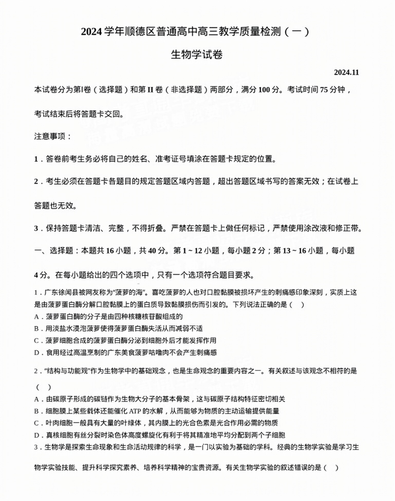 广东省佛山市2024学年顺德区普通高中高三教学质量检测(一)生物及答案