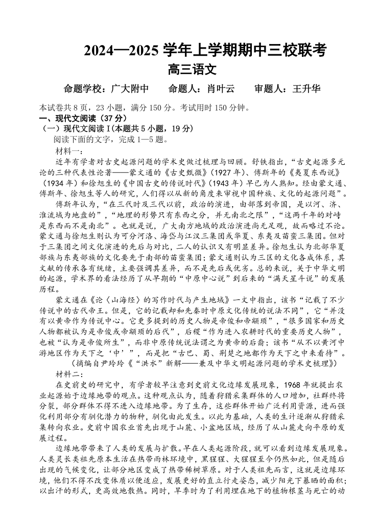广东省广州外国语、广大附中、铁一中学等三校2025届高三上学期期中联考语文及答案