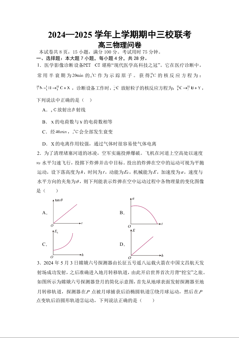 广东省广州外国语、广大附中、铁一中学等三校2025届高三上学期期中联考物理及答案