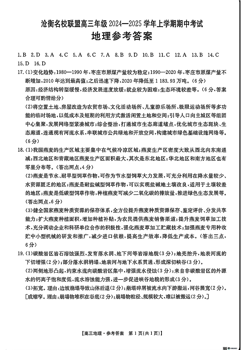 河北省沧衡名校联盟2024-2025学年高三11月期中考试地理答案