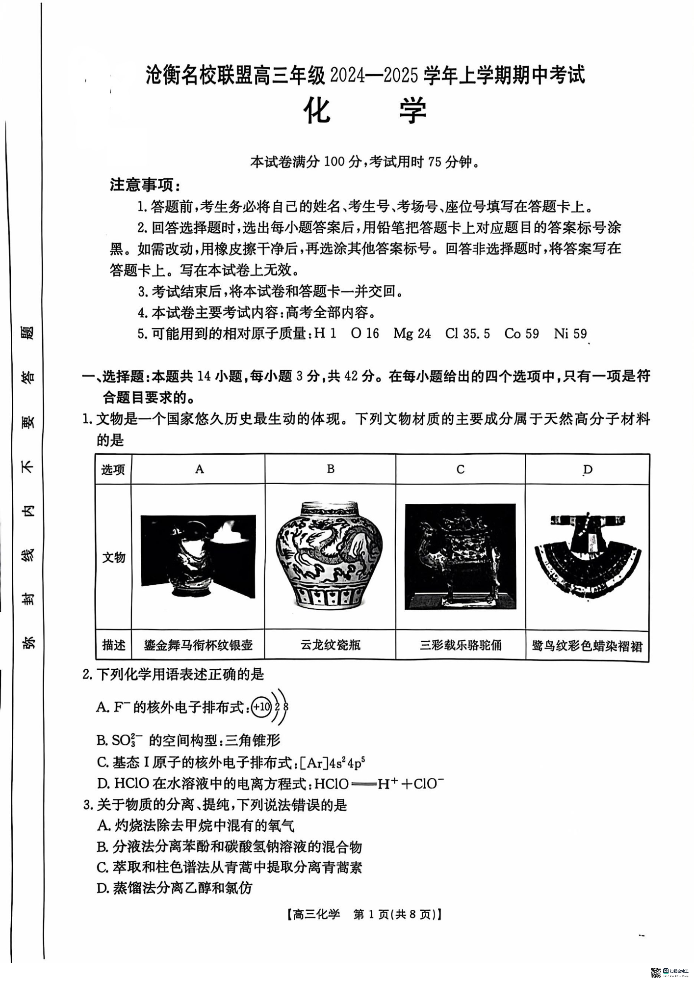 河北省沧衡名校联盟2024-2025学年高三11月期中考试化学