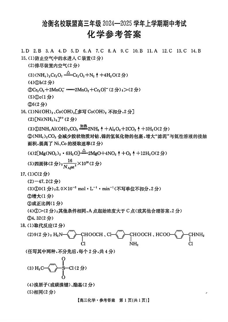 河北省沧衡名校联盟2024-2025学年高三11月期中考试化学答案