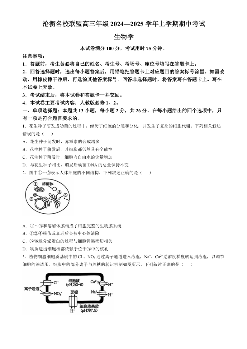 河北省沧衡名校联盟2025届高三上学期11月期中考试生物及答案