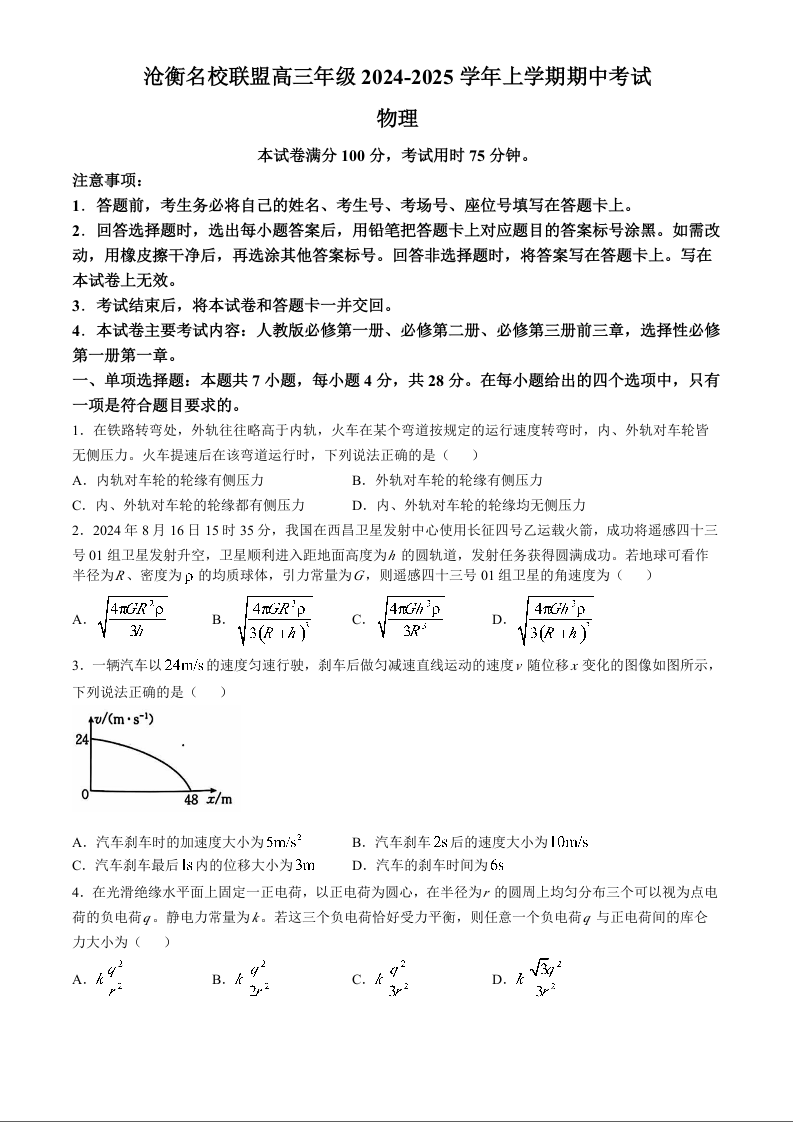 河北省沧衡名校联盟2025届高三上学期11月期中考试物理及答案