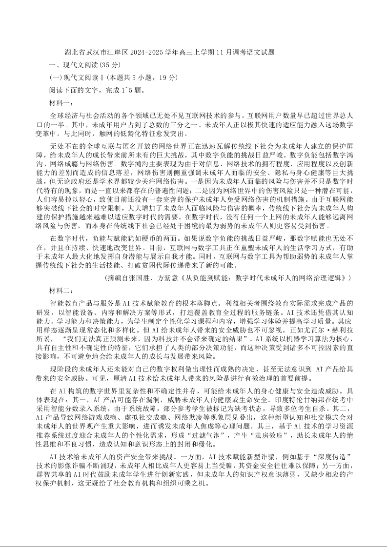 湖北省武汉市江岸区2024-2025学年高三上学期11月调考语文及答案