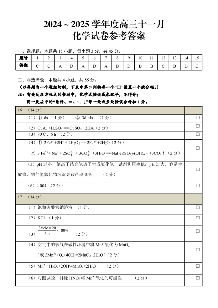 湖北省武汉市江岸区2024-2025学年高三上学期11月调考化学答案