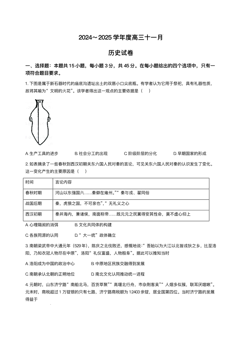 湖北省武汉市江岸区2024-2025学年高三上学期11月调考历史及答案