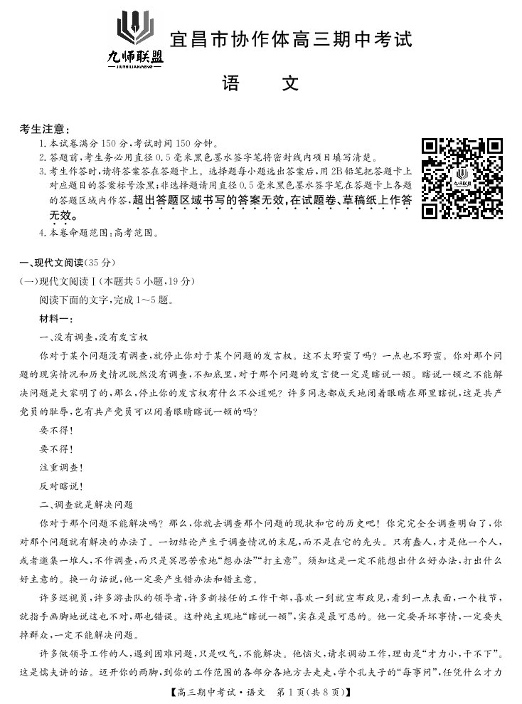 湖北省宜昌协作体2025届高三11月联考语文