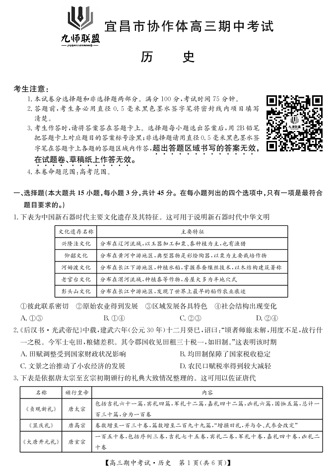 湖北省宜昌协作体2025届高三11月联考历史