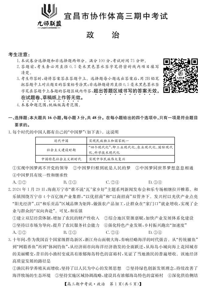 湖北省宜昌协作体2025届高三11月联考政治