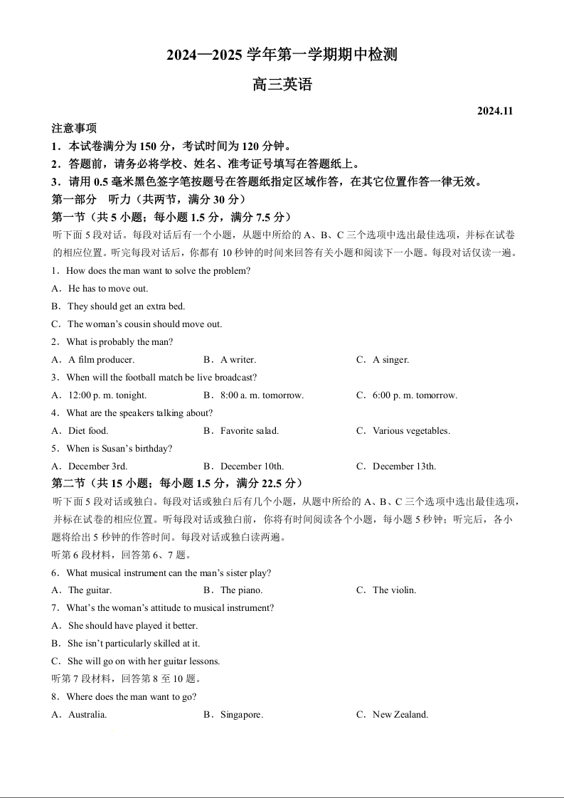 江苏省扬州市2024-2025学年高三上学期11月期中英语+答案