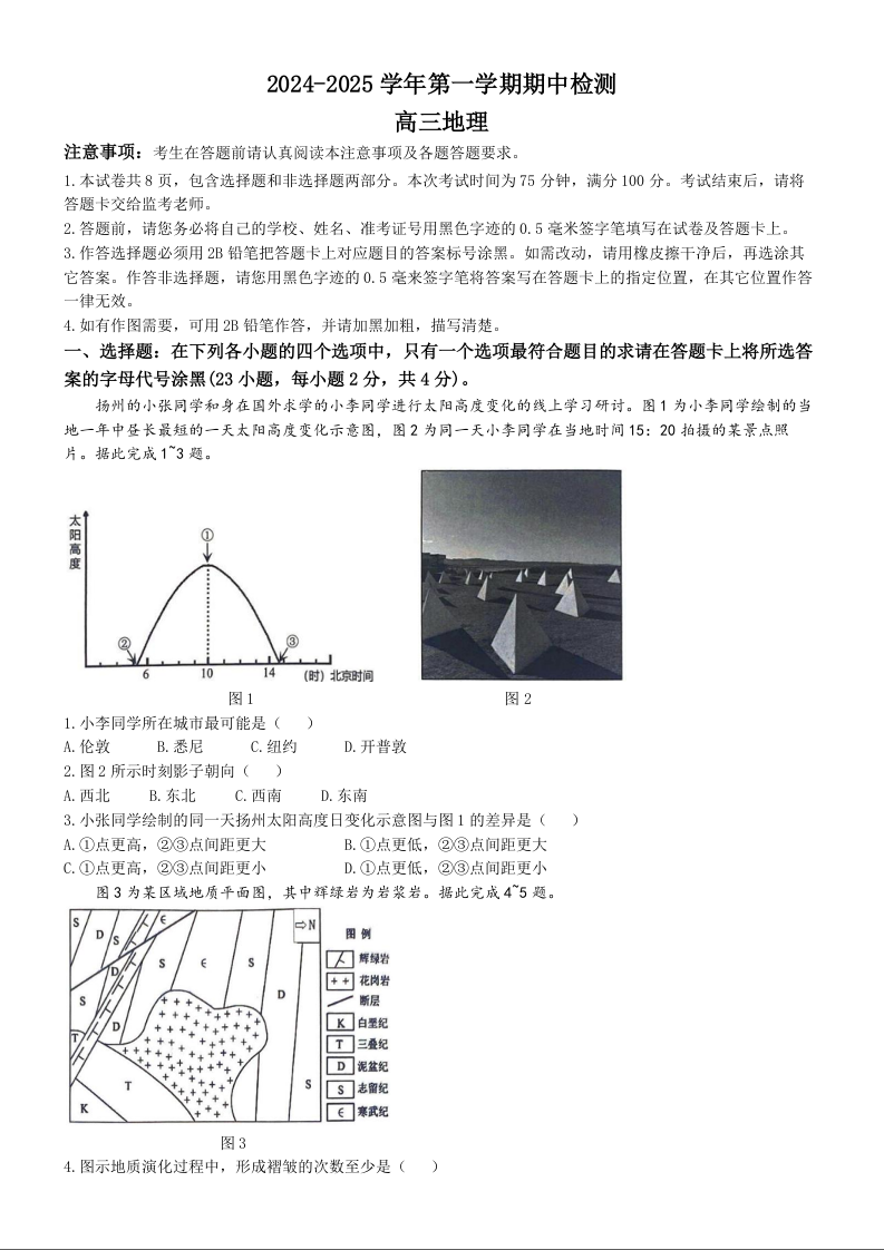 江苏省扬州市2025届高三上学期11月期中考试地理+答案