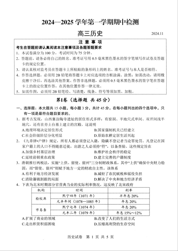 江苏省扬州市2025届高三上学期11月期中考试历史+答案