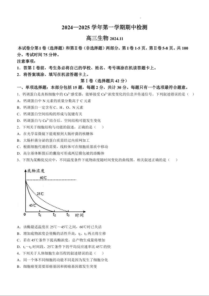 江苏省扬州市2025届高三上学期11月期中考试生物+答案