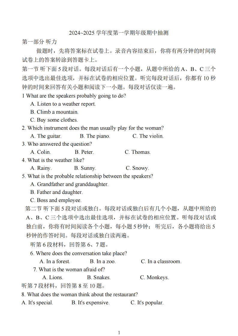 江苏省徐州市2025届高三上学期11月期中考试英语