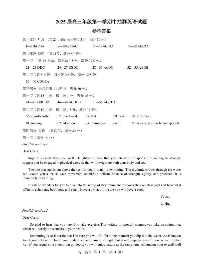 江苏省徐州市2025届高三上学期11月期中考试英语答案