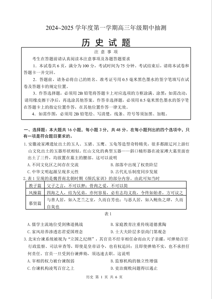 江苏省徐州市2025届高三上学期11月期中考试历史