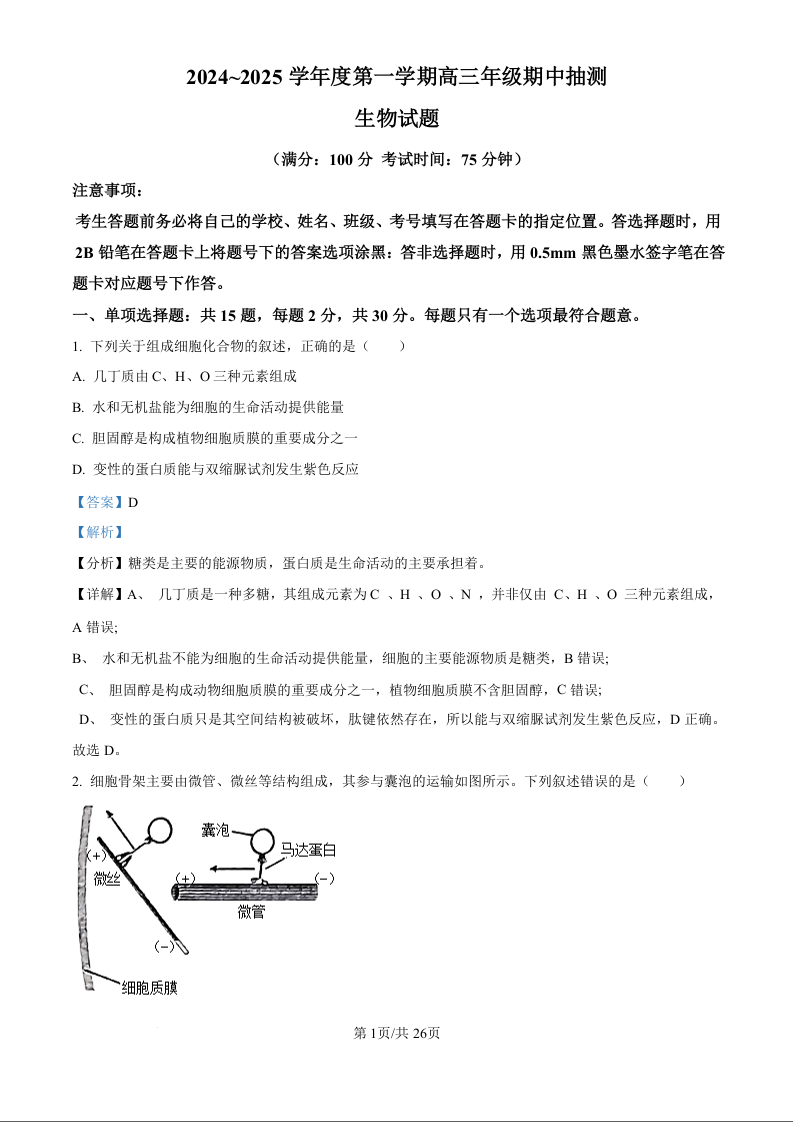 江苏省徐州市2025届高三上学期11月期中考试生物(精品解析版)