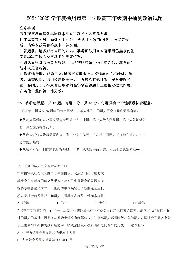 江苏省徐州市2025届高三上学期11月期中考试政治 (原卷版)