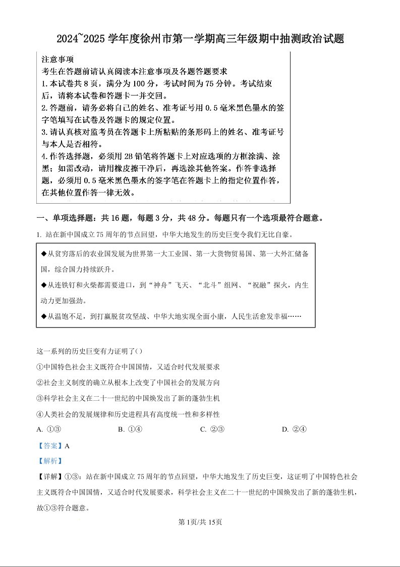 江苏省徐州市2025届高三上学期11月期中考试政治 (精品解析版)