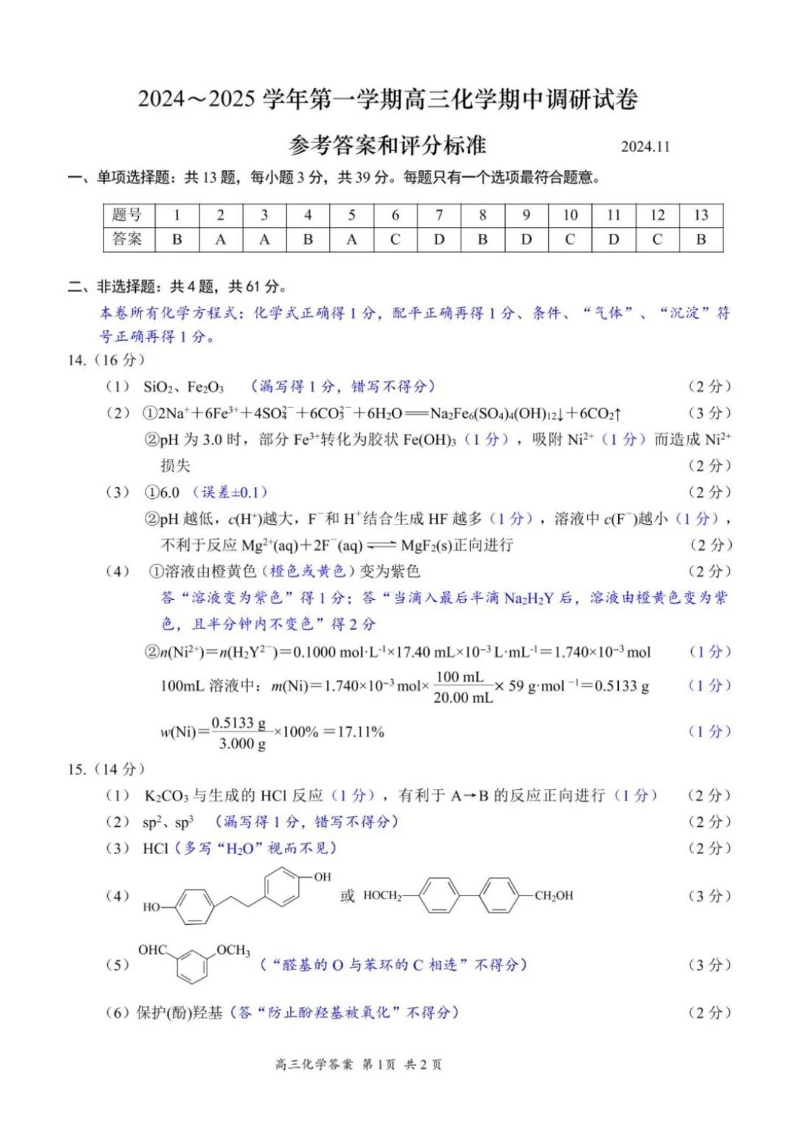 江苏省苏州市2025届高三上学期11月期中调研化学答案
