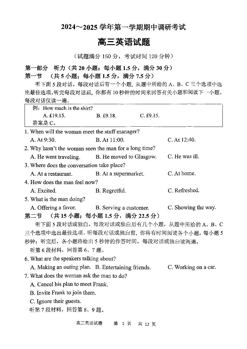 江苏省连云港市2025届高三上学期11月期中考试英语