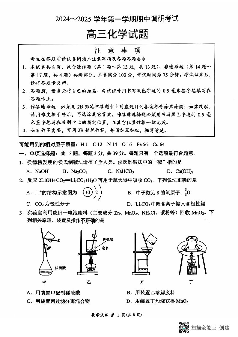 江苏省连云港市2025届高三上学期11月期中考试化学