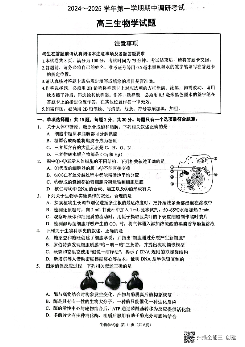 江苏省连云港市2025届高三上学期11月期中考试生物
