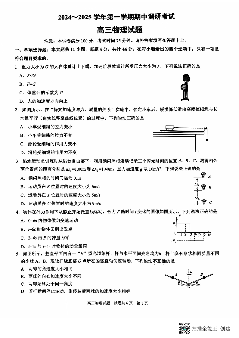 江苏省连云港市2025届高三上学期11月期中考试物理