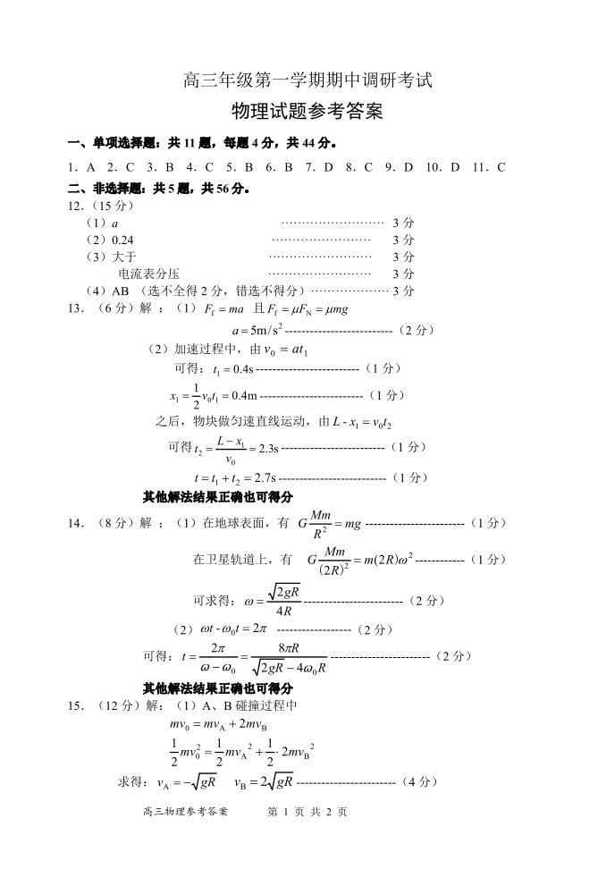 江苏省连云港市2025届高三上学期11月期中考试物理答案