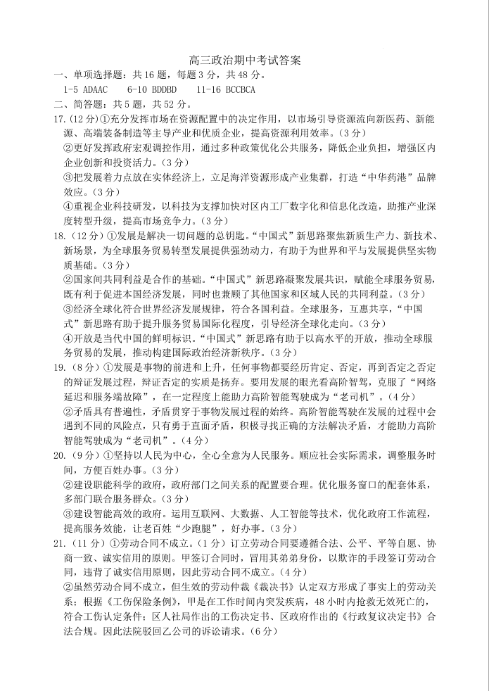 江苏省连云港市2025届高三上学期11月期中考试政治答案