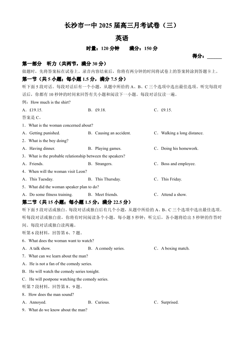 湖南省长沙市一中2025届高三月考试卷(三)英语