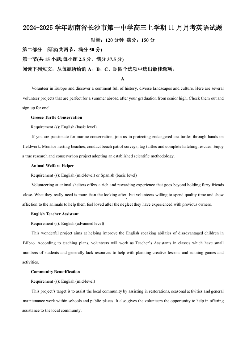 湖南省长沙市一中2025届高三月考试卷(三)英语(含解析)