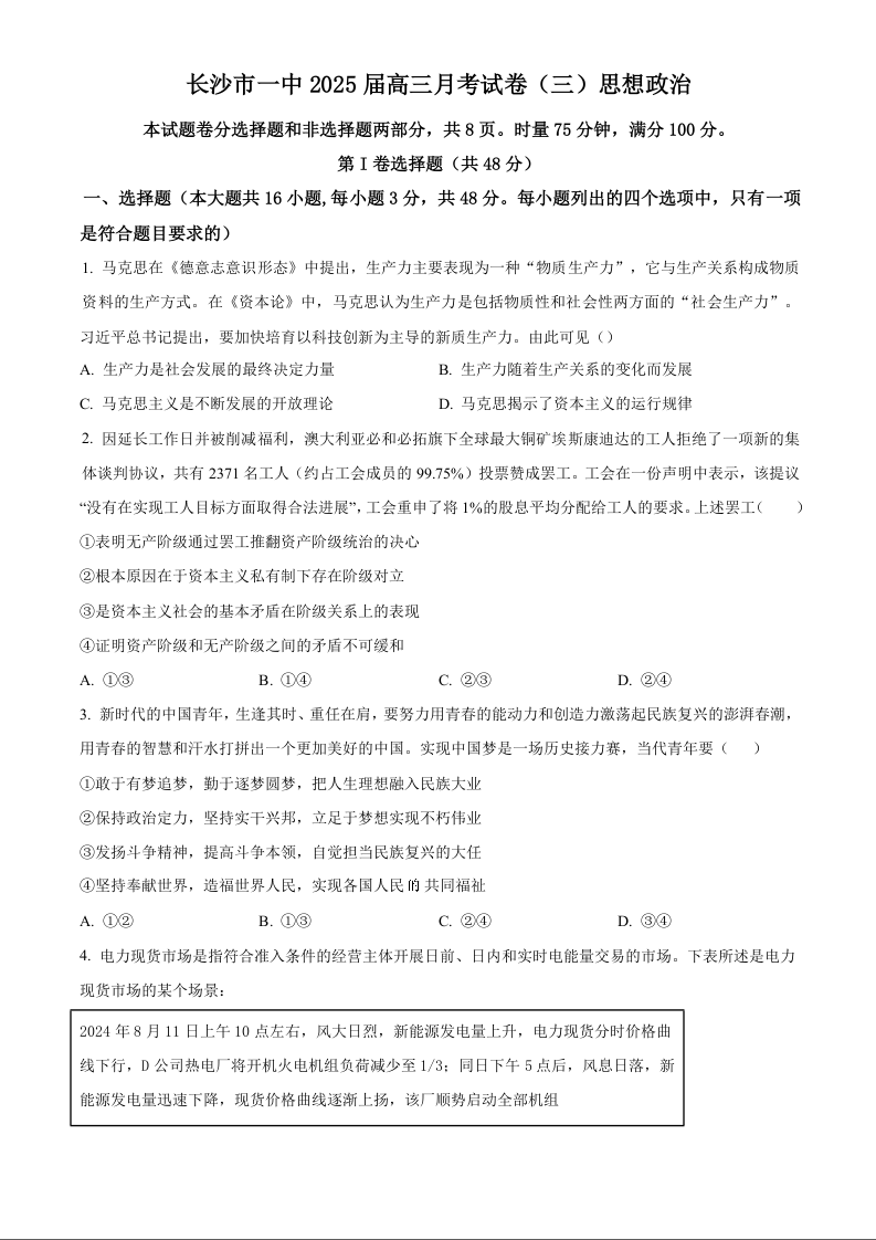 湖南省长沙市一中2025届高三月考试卷(三)政治