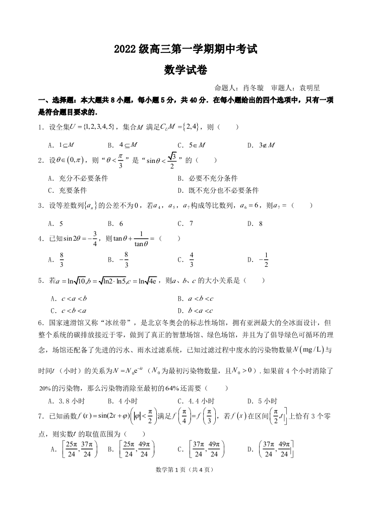 广东省汕头市金山中学2022级高三第一学期期中考试数学
