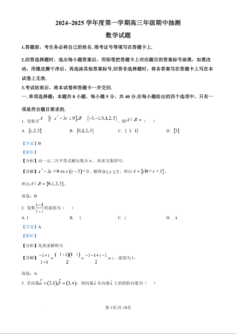 江苏省连云港市2025届高三上学期11月期中考试数学(精品解析版)