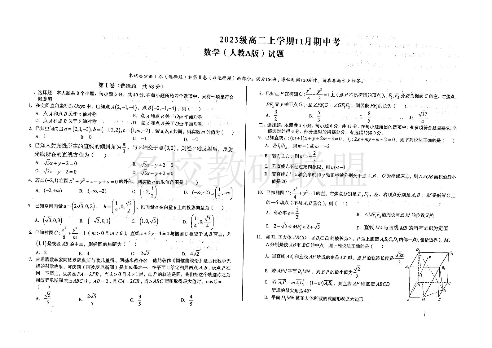 安徽省A10联盟2024-2025学年高二上学期11月期中考试 数学