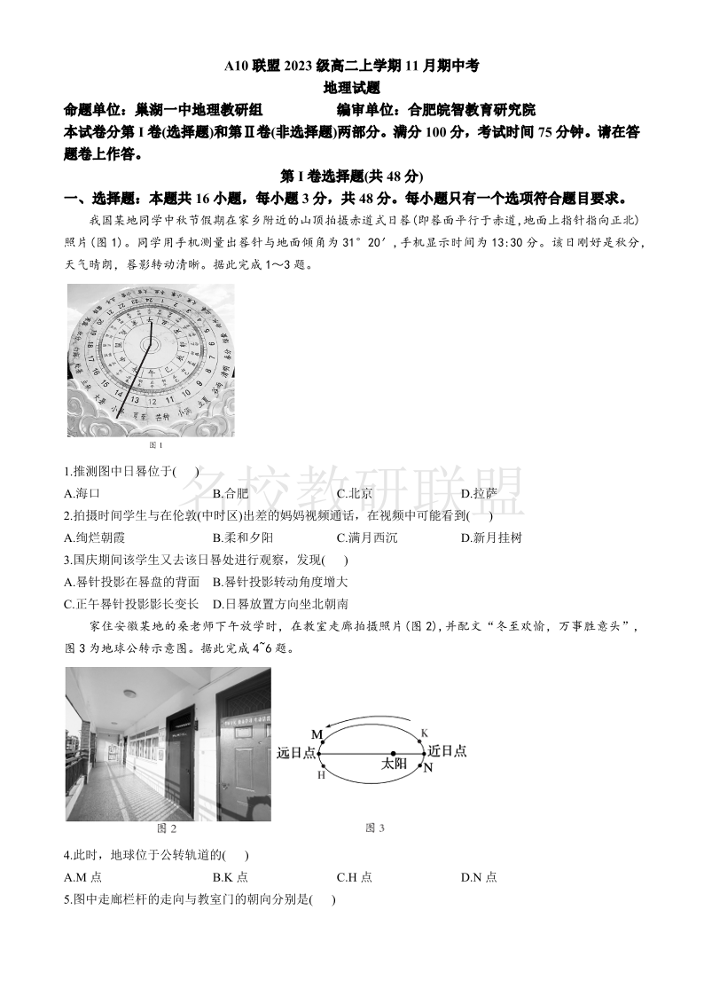安徽省A10联盟2024-2025学年高二上学期11月期中考试 地理