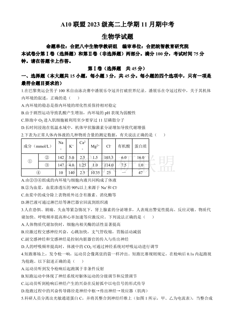安徽省A10联盟2024-2025学年高二上学期11月期中考试 生物