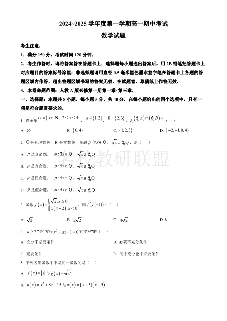 安徽省滁州市九校联考2024-2025学年高一上学期11月期中考试 数学